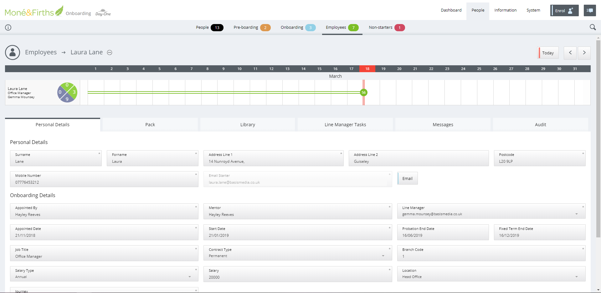 Each candidates personal information is displayed on the [Personal Details] page, along with their timeline of events which displays the date appointed, the start date and when tasks are complete by the Candidate and Line Manager.