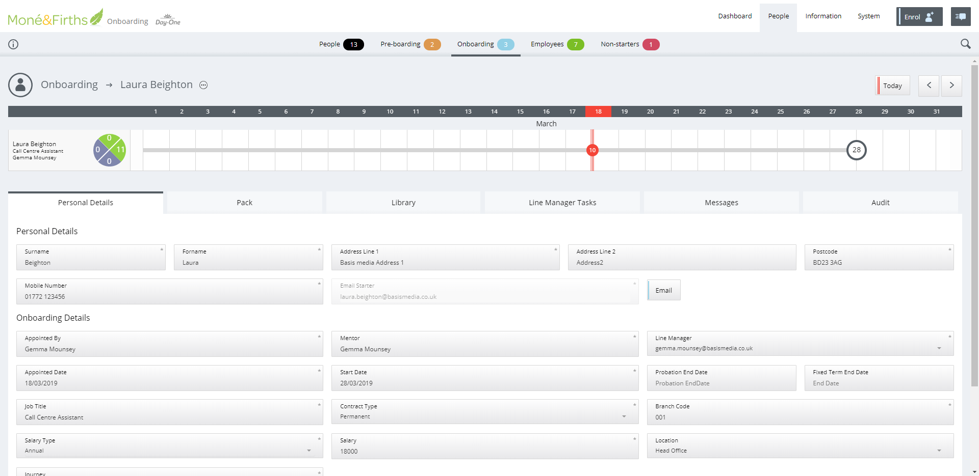 Each candidates personal information is displayed on the [Personal Details] page, along with their timeline of events which displays the date appointed, the start date and when tasks are complete by the Candidate and Line Manager.