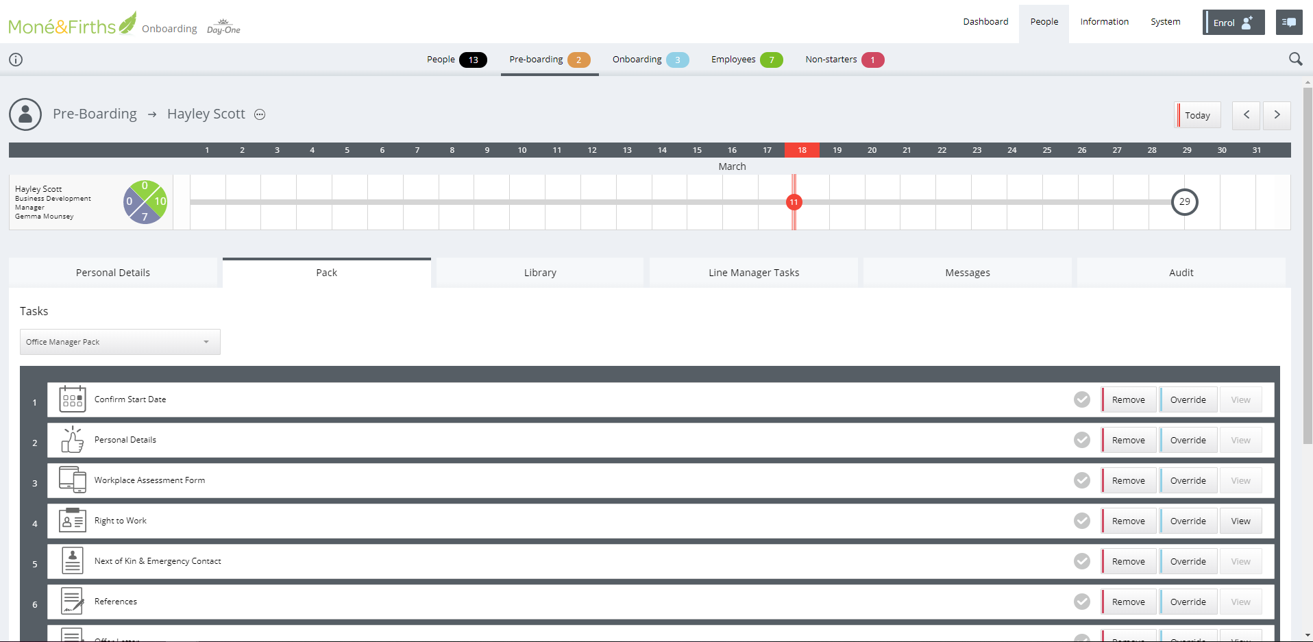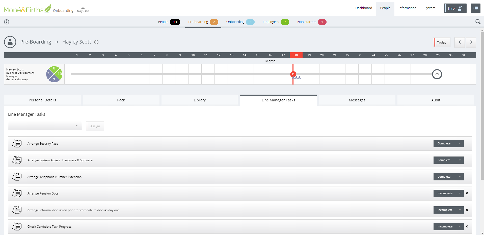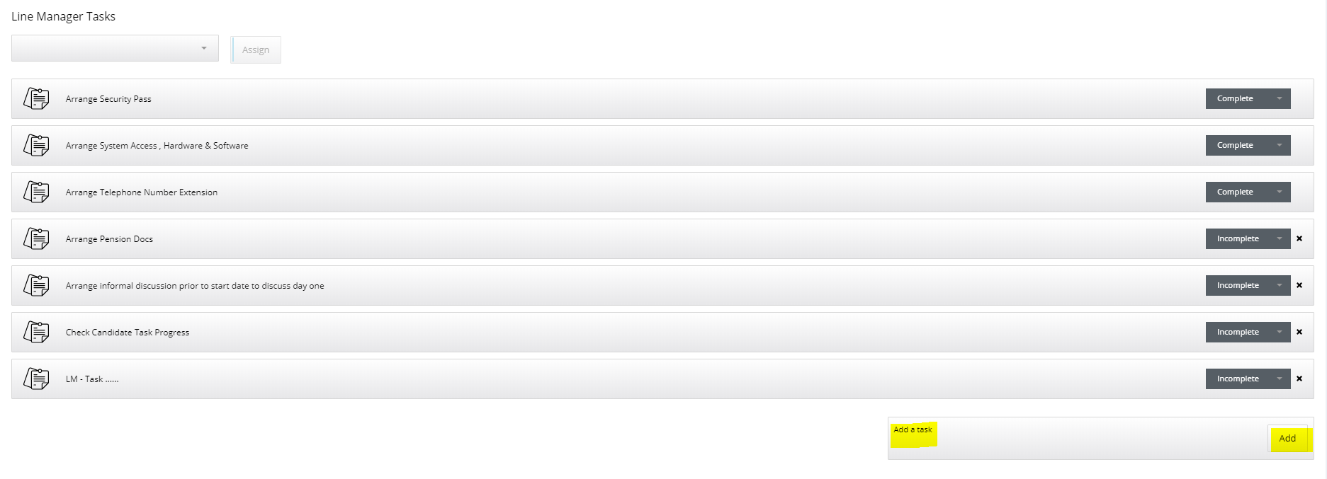 Control Panel Users can assign a pre-defiled number of Line Manager Tasks to help with the Onboarding process, or can create individual tasks for a Line Manager against a particular new hire: