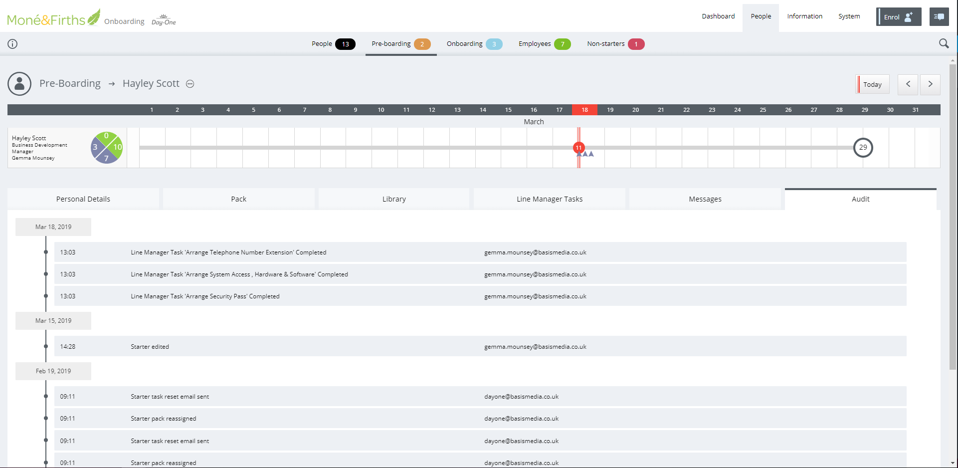 Control Panel Users can view the Audit against each new hire by clicking on the [Audit] tab within a new hires record