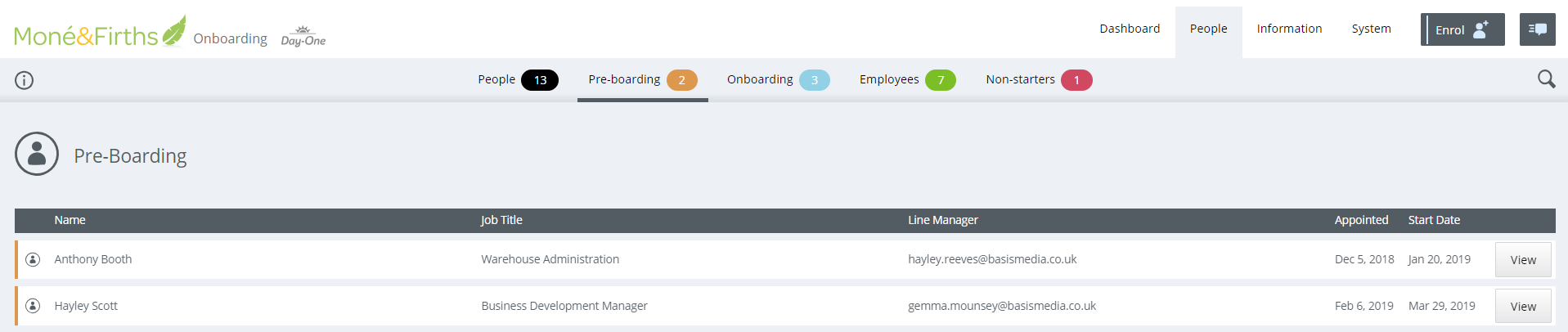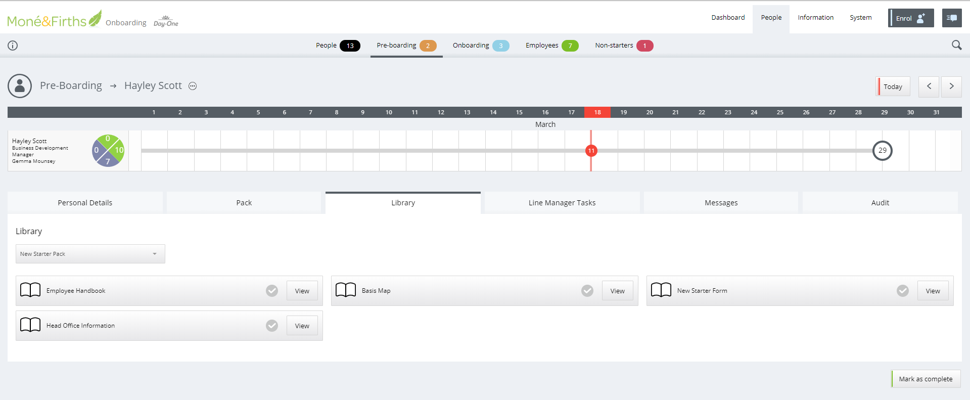 The pre-determined Line Manager tasks are created in the Information tab of the control panel and assigned when setting up a new hire.