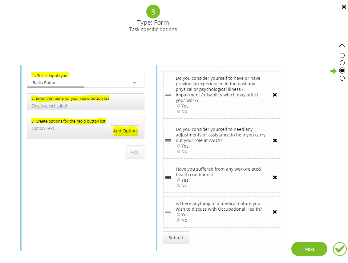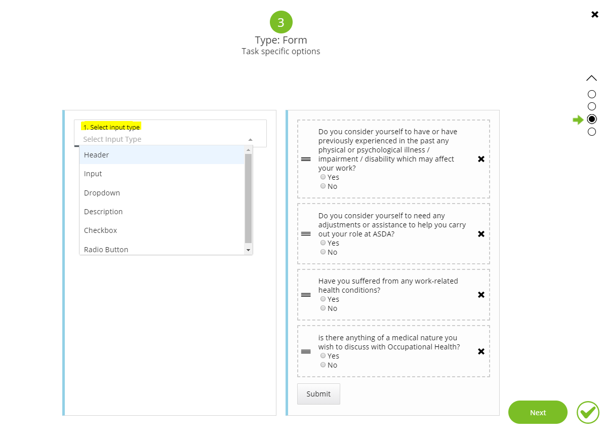 Step 3 – Select the input type using the drop-down option on the left and add the questions and answer options for each question.