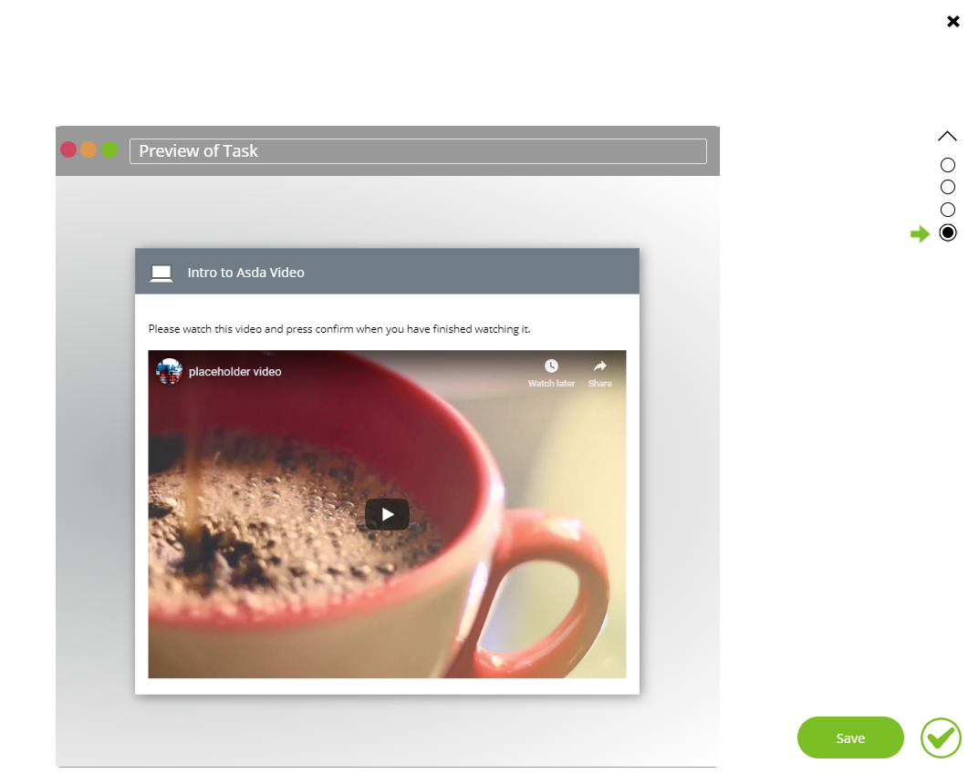 This task requires the candidate to view a video which is iFramed into the task overlay and confirm the action