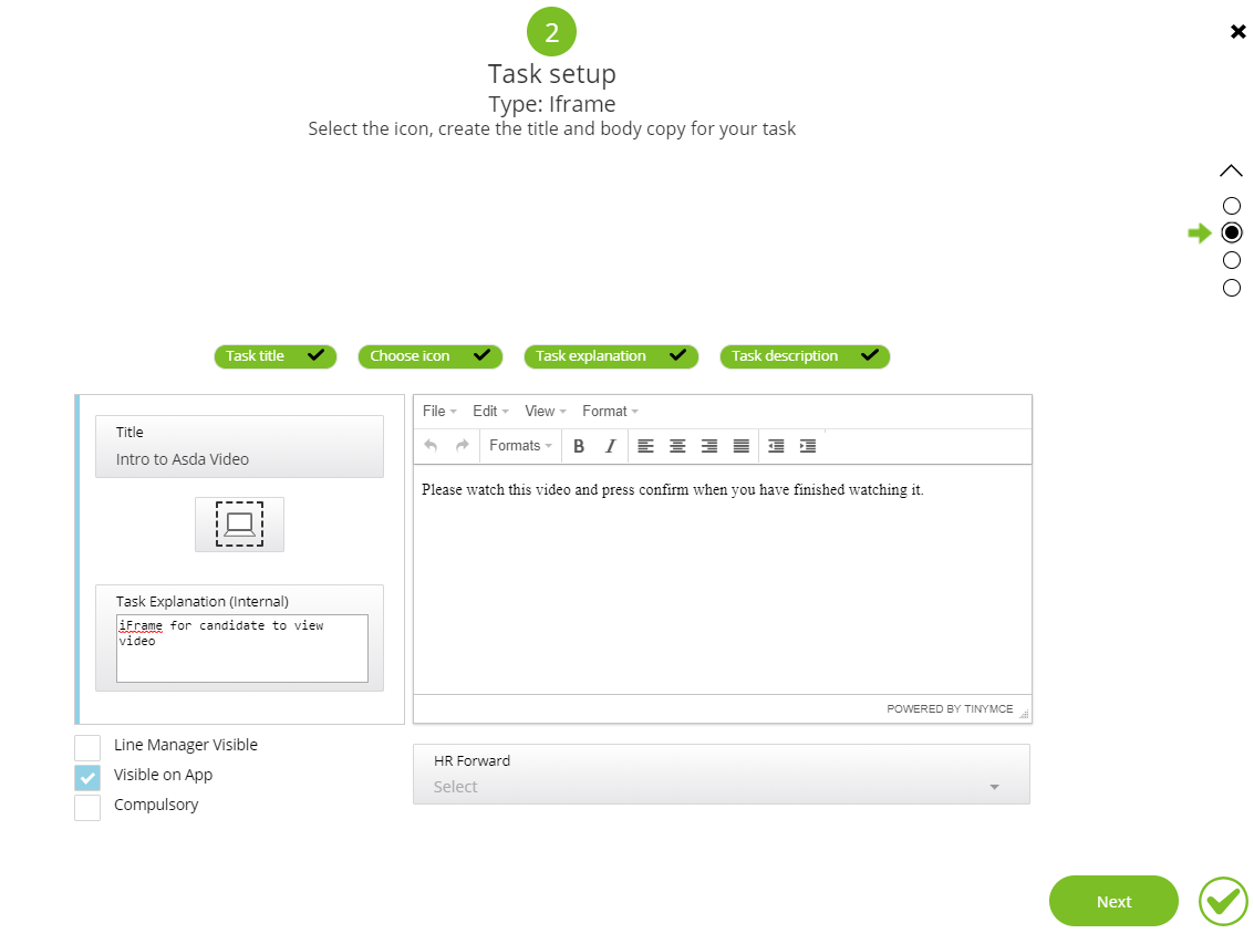 The Task Setup Page will appear. Here you need to add the Task Title, Icon associated with the task, Internal Task explanation, instructions to the candidate and what happens to the task on completion (i.e. if a form has been complete, where should it be sent internally/externally?)