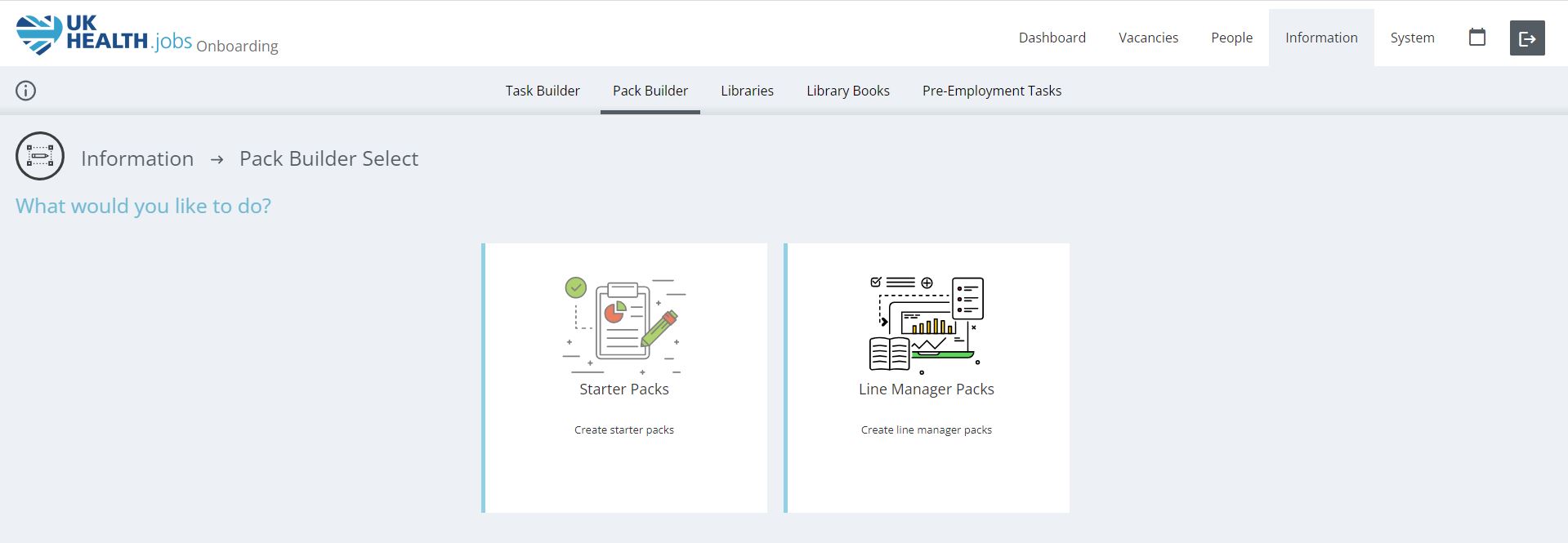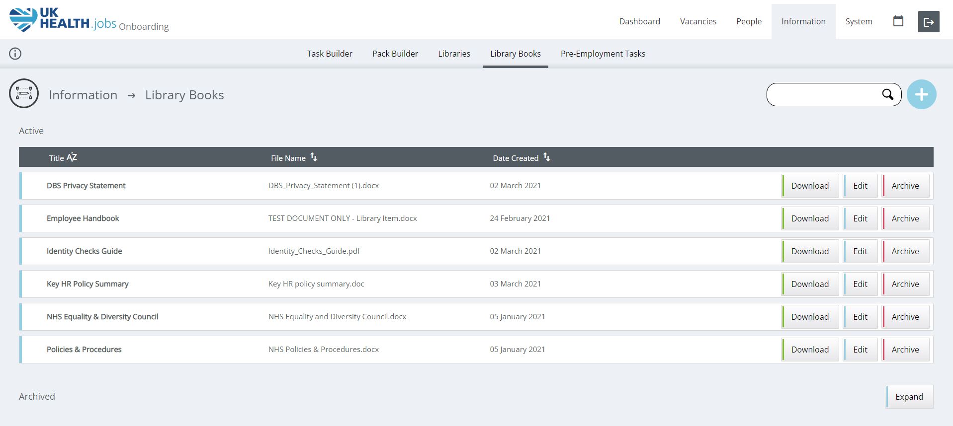The Libraries section holds packs of documents and relevant information that the Onboarding candidates need to have access too, such as policies and procedures, guides, leaflets, documents.